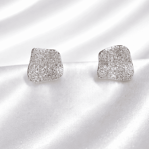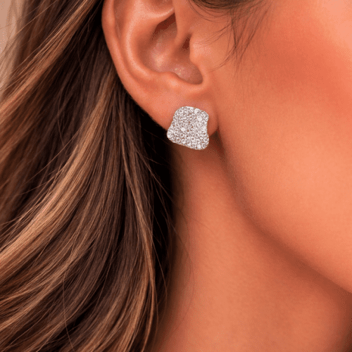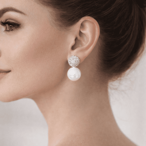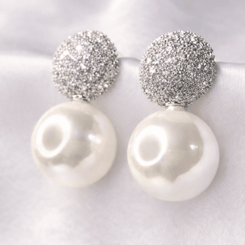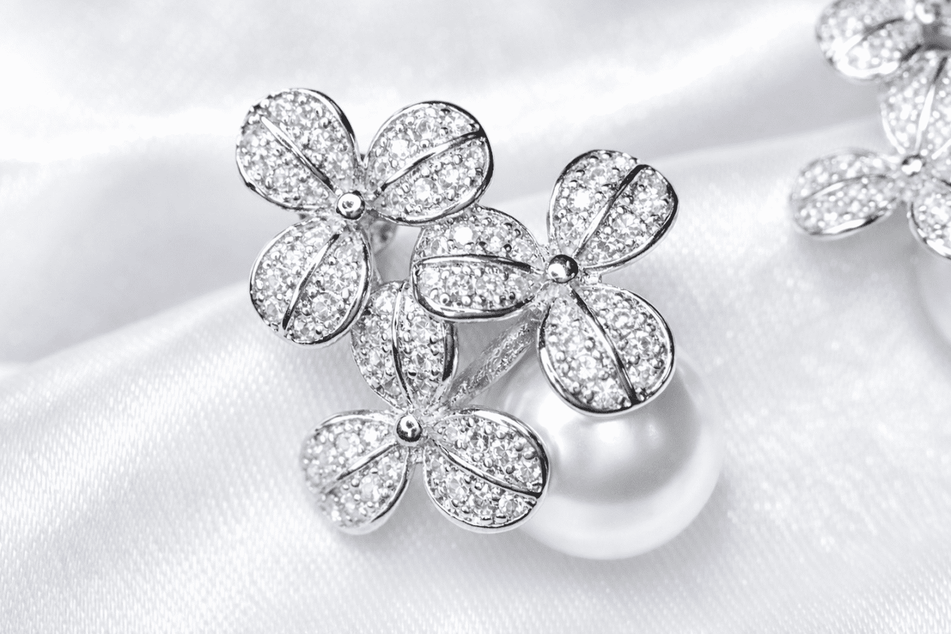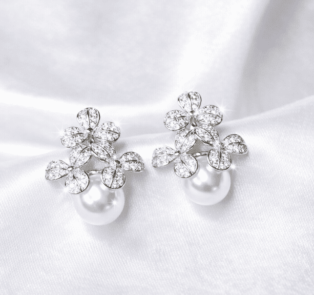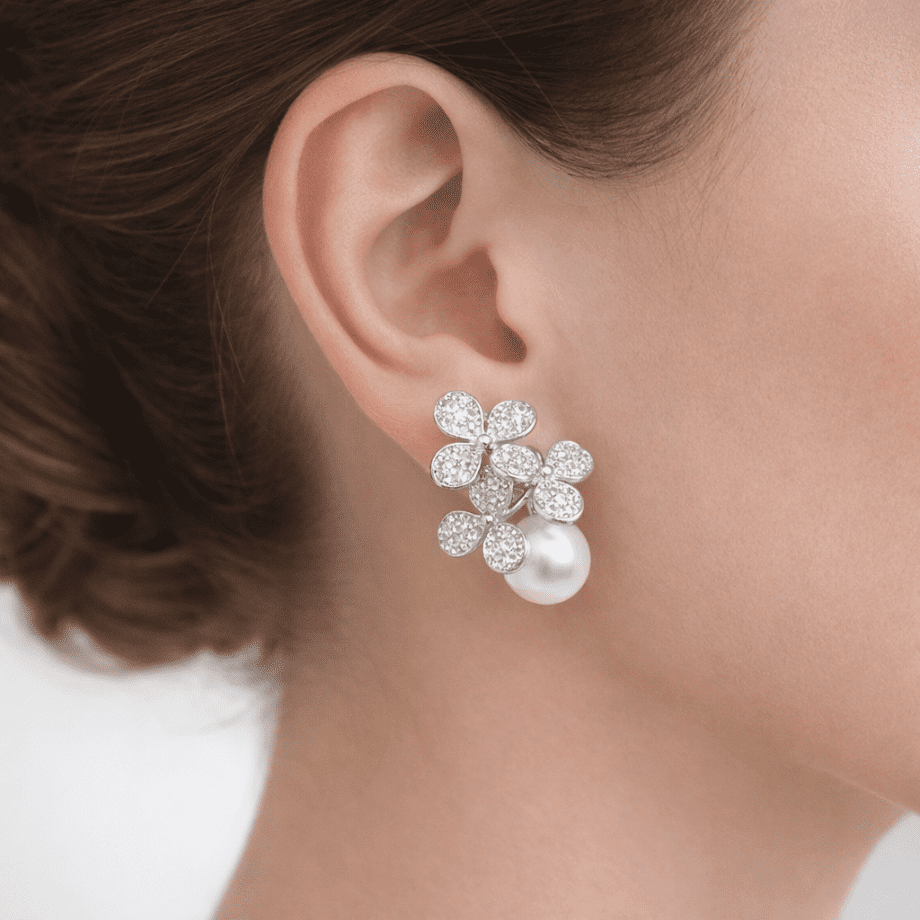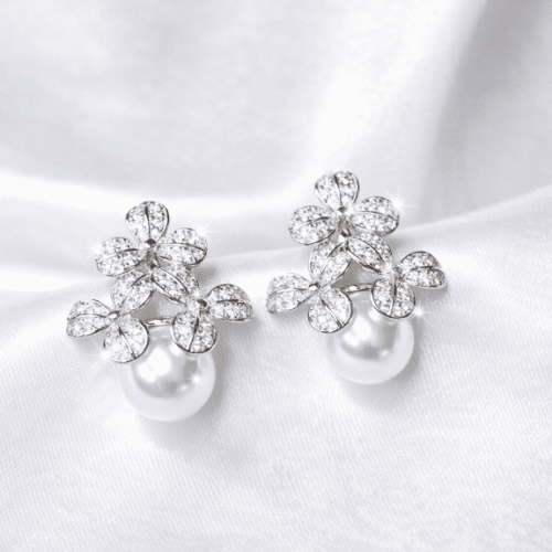 Brinco prateado com pérolas e pequenas flores cravejadas de micro zircônias