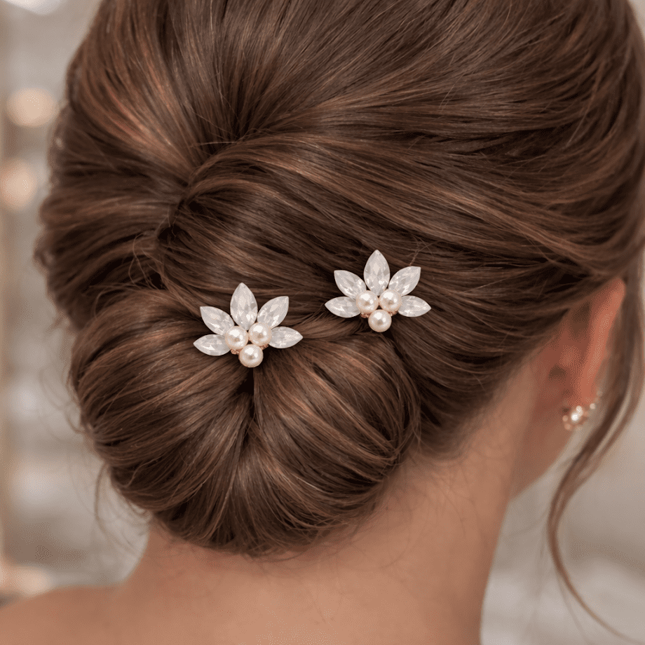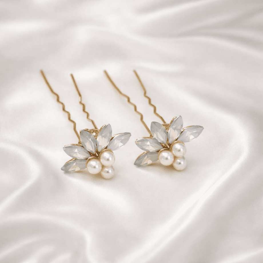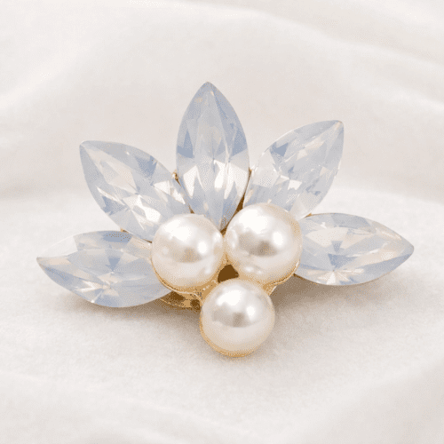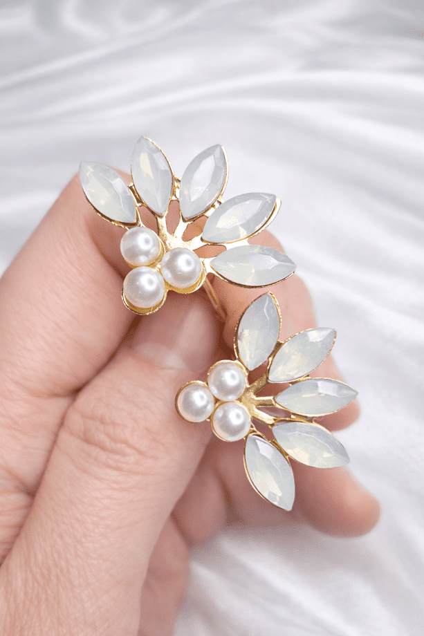 Par de grampos dourados com pérolas e cristais